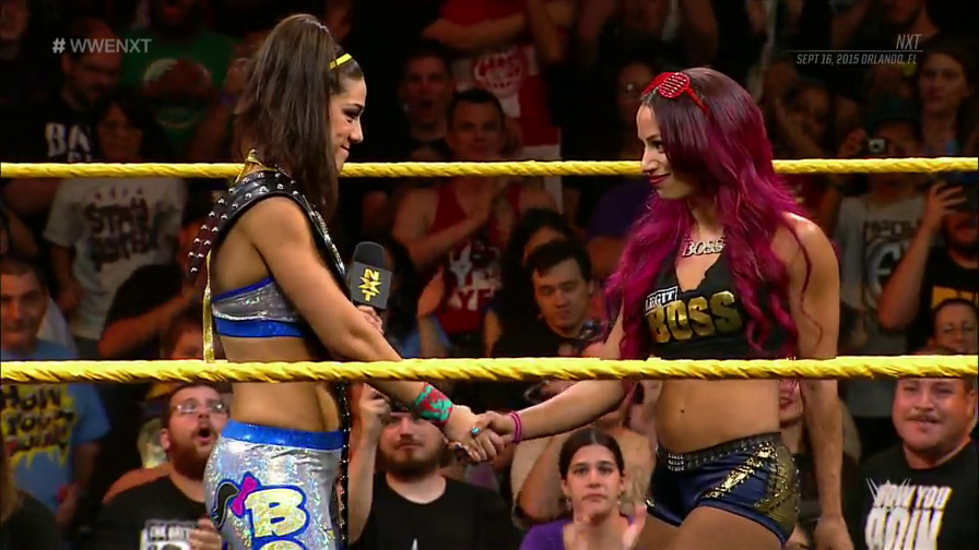 she looks at Bayley, looks around at the crowd as they chant “Match